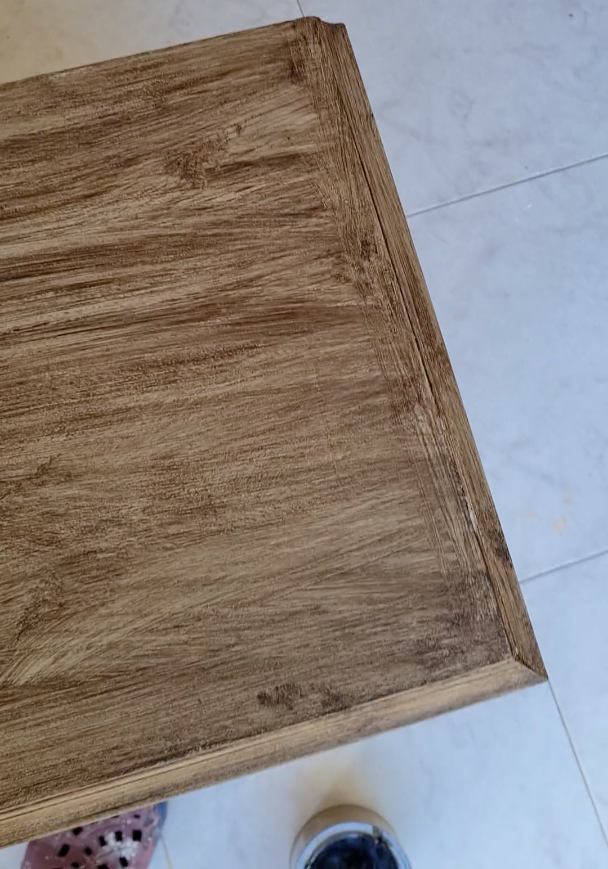 La idea consiste en crear un efecto de madera rústica a base de pintar la pieza con un color claro o tirando a tierra y darle una pasada con cera más oscura y pasar un cepillo para crear el efecto de vetas de madera. Este efecto se le denomina Faux Wood en inglés.